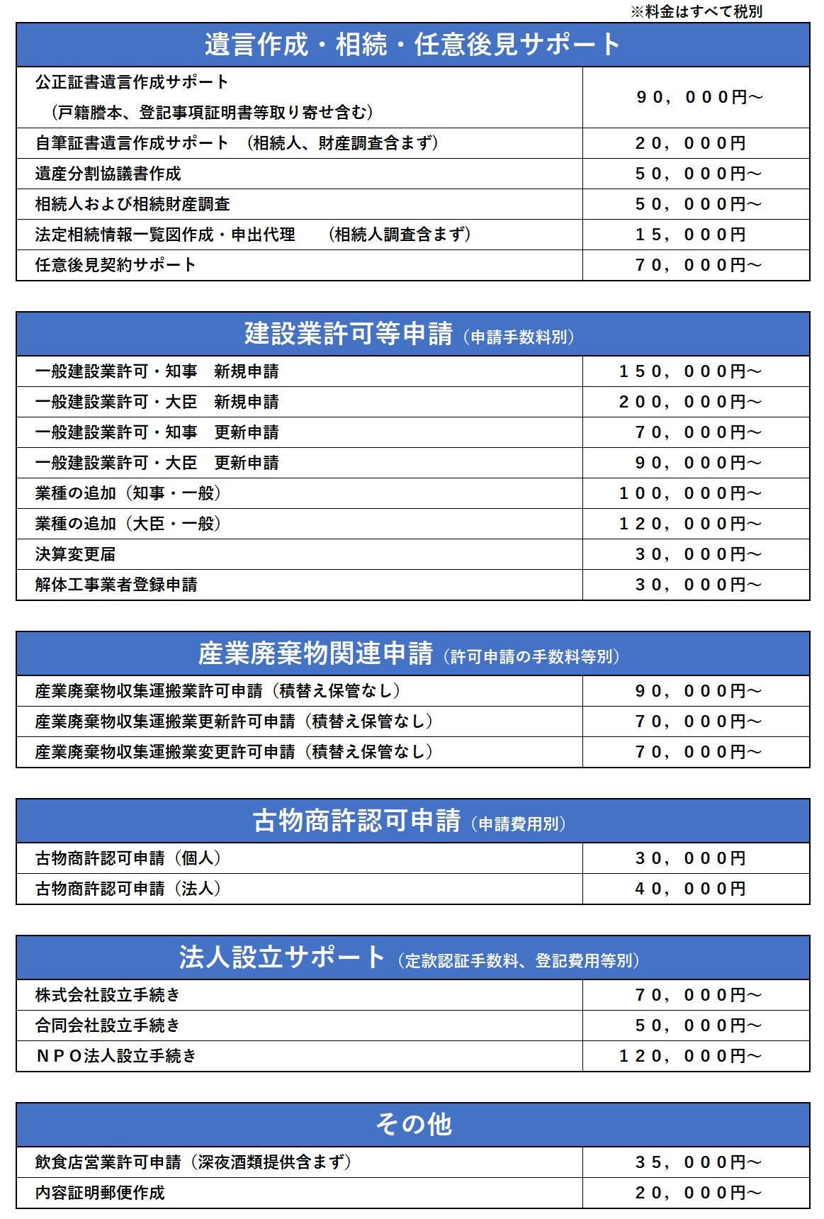 ・上記、役所等に支払う申請手数料、必要書類取得のための実費は含んでおりません。